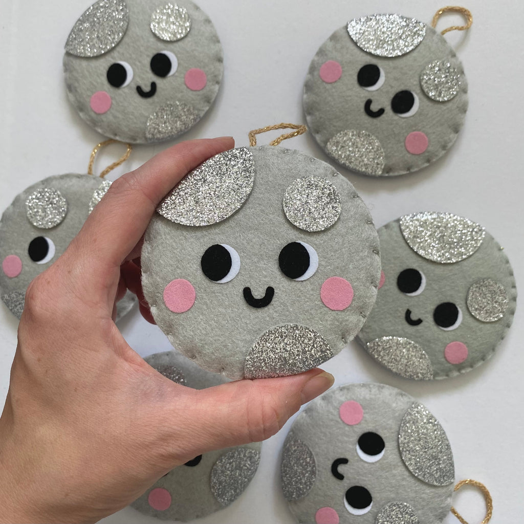 Moon hanging decoration with rosy cheeks. Made from wool blend felt and silver glitter vinyl.