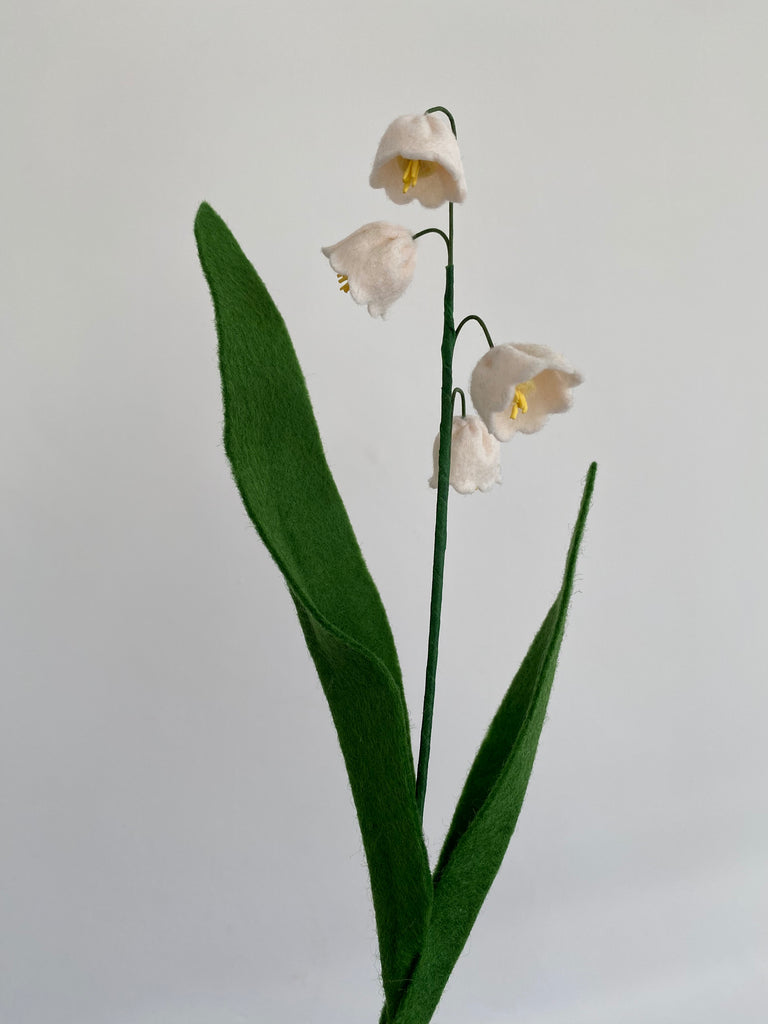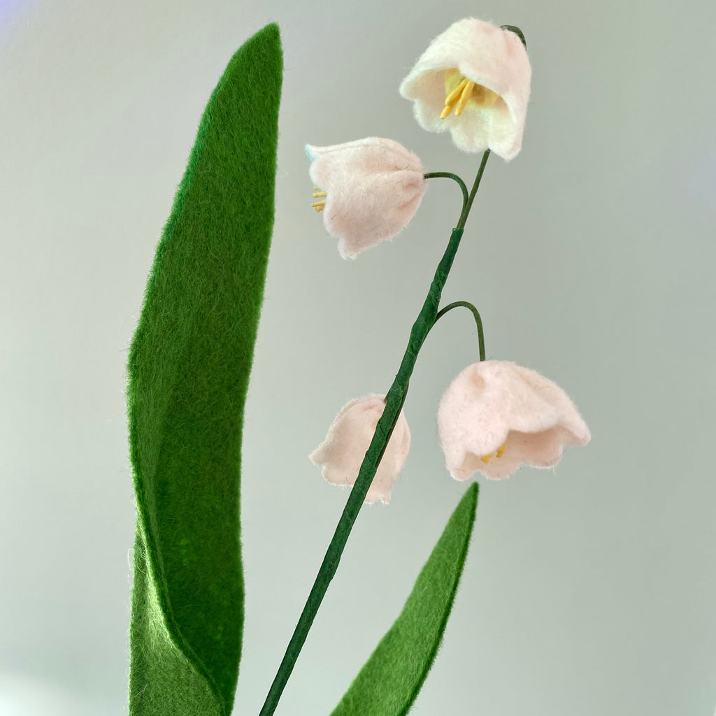Lily of the valley stem, with 4 flower heads made from polyester felt and two wired leaves made from wool felt.