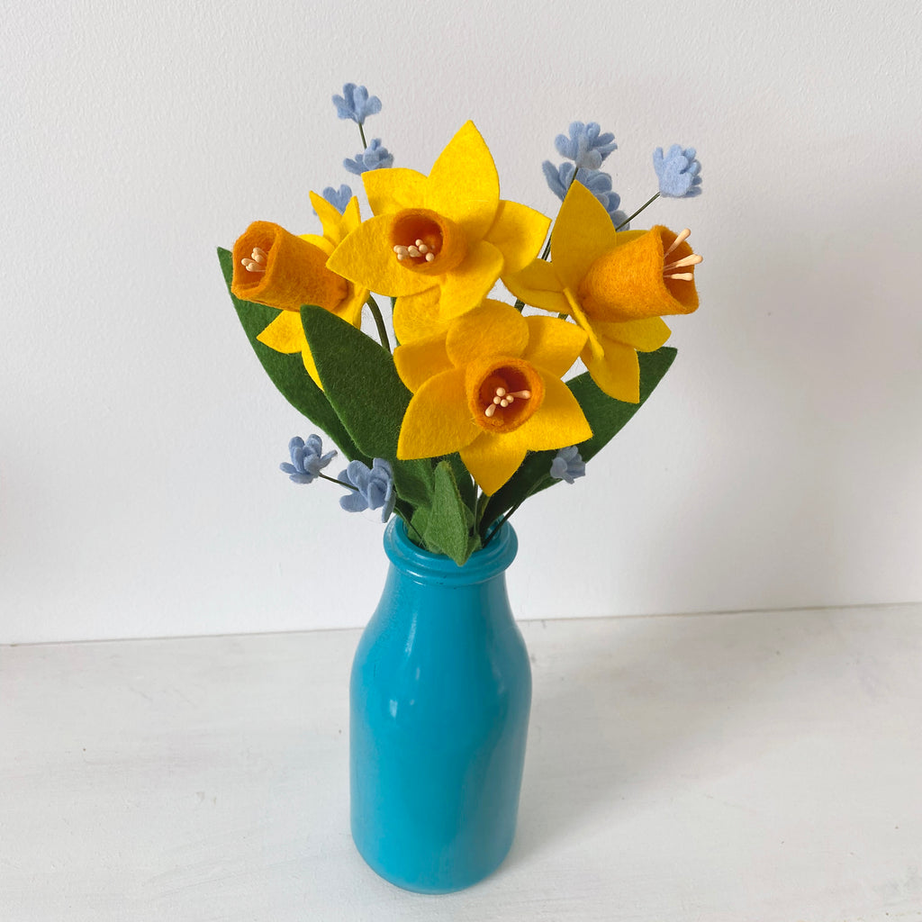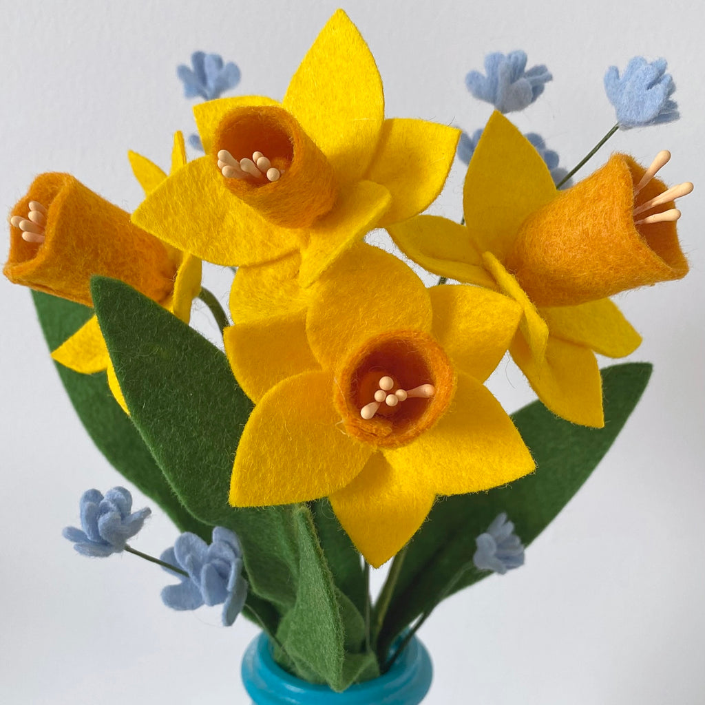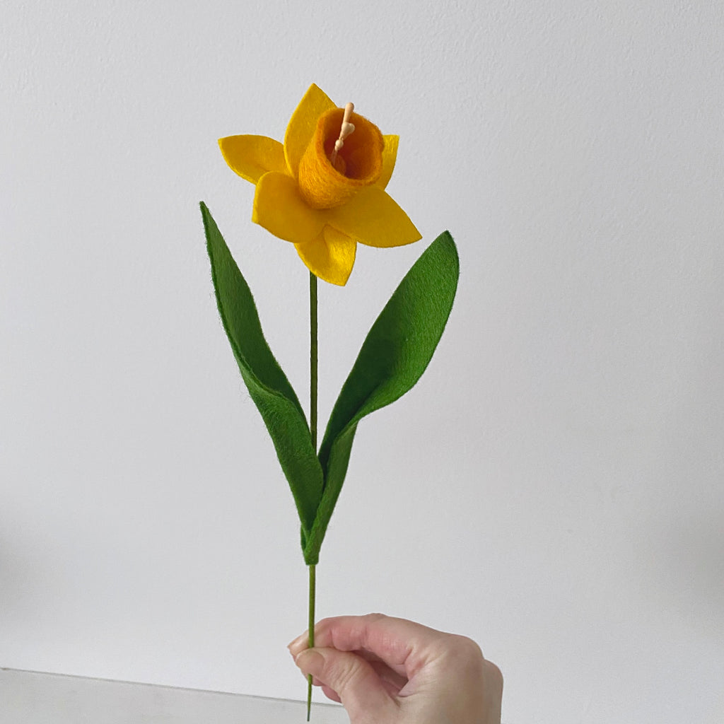 Felt daffodils made from wool blend felt. Each stem measures approximately 30cm tall, with the flower head measuring approximately 6cm wide.
